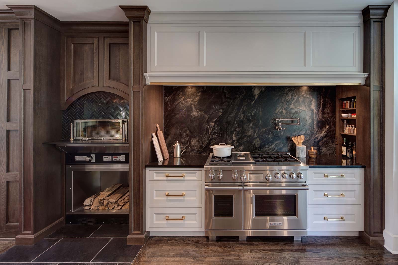 Top of the list in this whole home remodel was this kitchen renovation. With a vision to make this large 20′ x 21′ foot space the center of everything from family gatherings to hosting little league football teams to everyday afternoon homework. Anchoring the kitchen is a large island big enough for the family to gather and spread out their meal prep and all join in cooking. Unique to this design is a wood-burning pizza oven, expertly designed around the secret large walk-in pantry. Despite the expansiveness of the space, the design and layout create a feeling of intimate proximity for each kitchen activity and the rich cabinetry, complimentary details and dramatic dark tones create warmth.