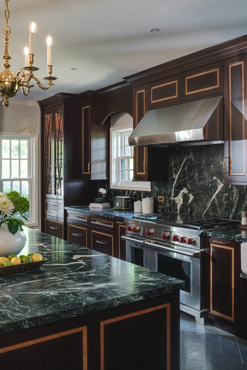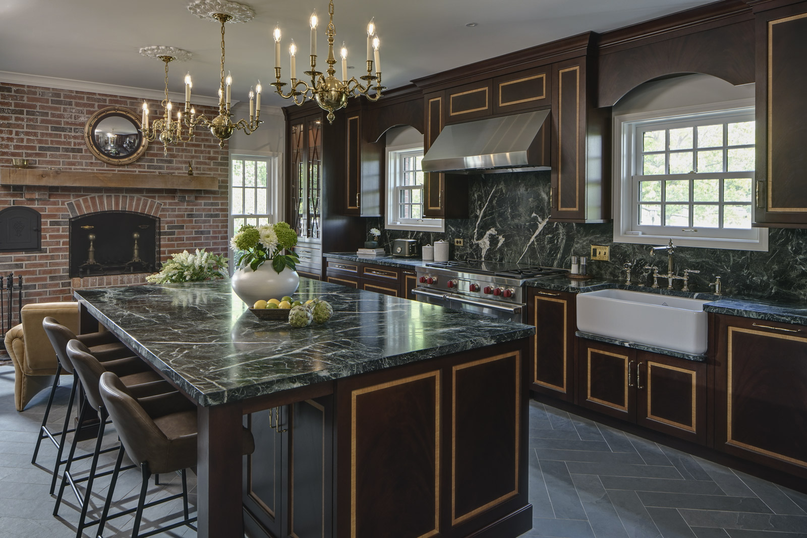 Upon learning the home’s true history, the homeowners purchased not only the property but also 85% of the original owner’s authentic Colonial furniture from storage, returning these pieces to their intended spaces. Their vision for the kitchen was inspired by a magnificent pair of antique mahogany cabinets with intricate inlay work – pieces that embodied the craftsmanship and elegance they wanted to achieve throughout the space.