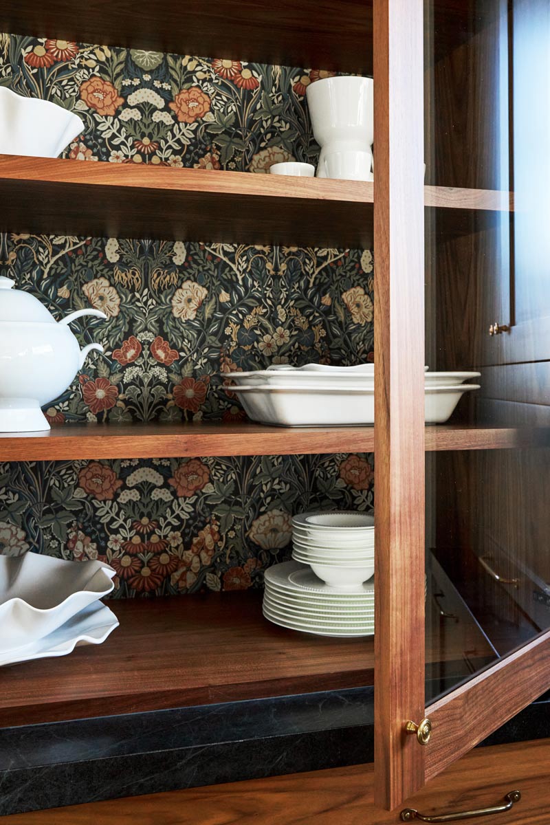 Glass-front serving cabinet with walnut interior and wallpaper backing