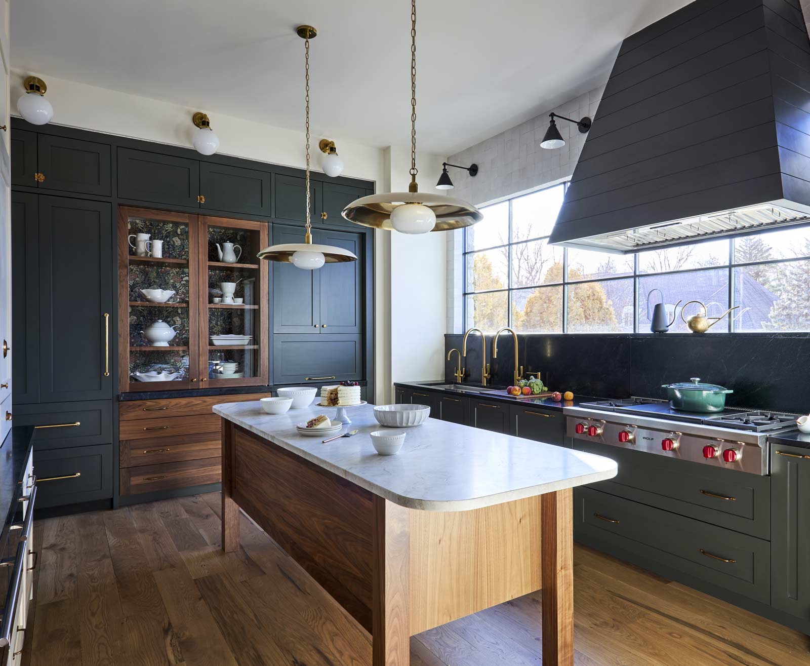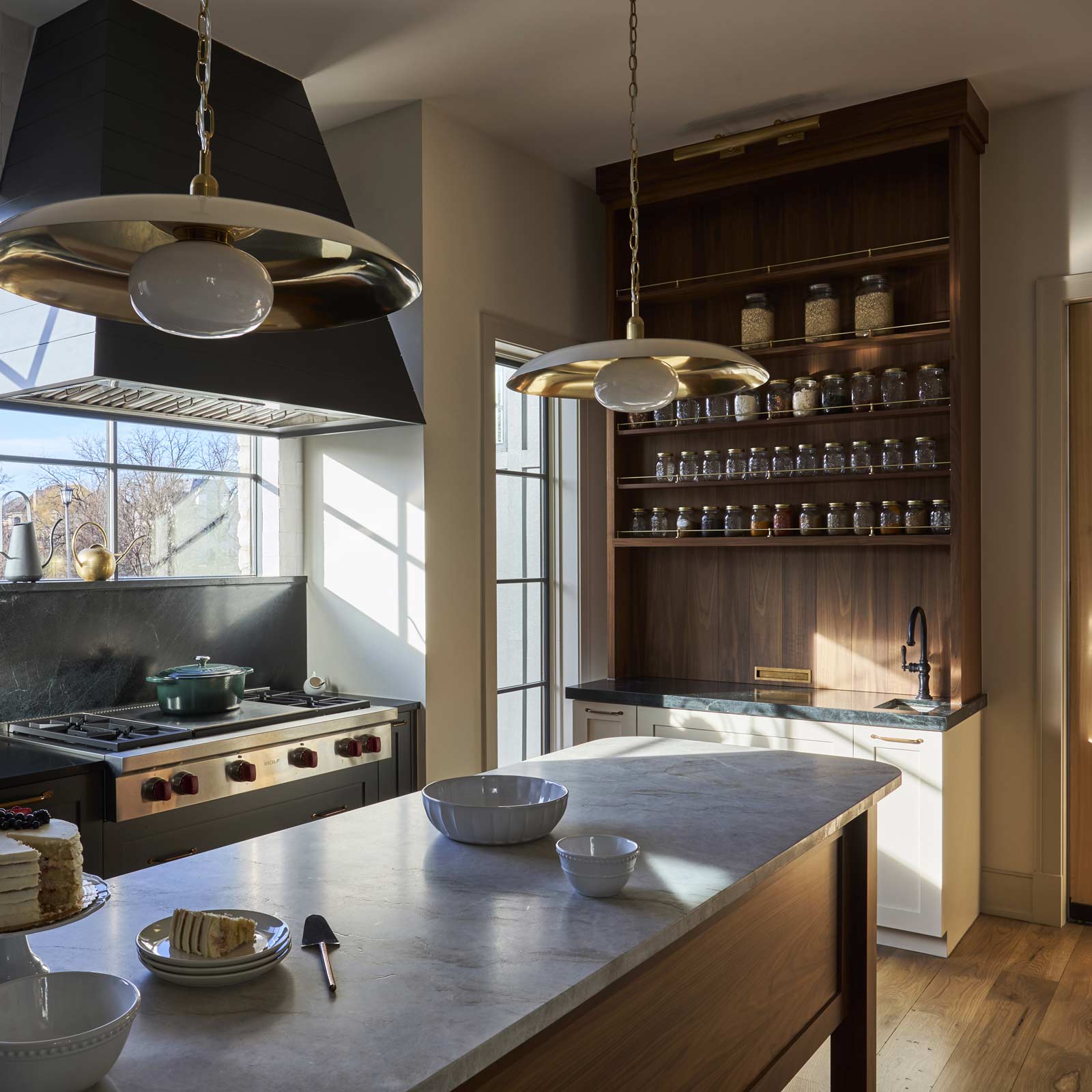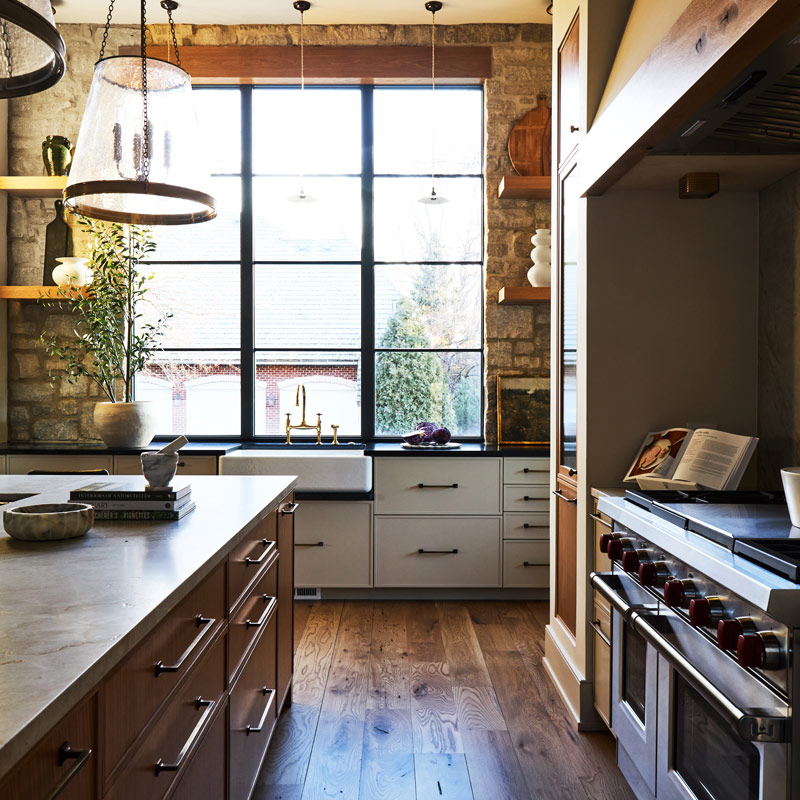 - Selecting a restrained material palette – deep green cabinetry, walnut accents, honed natural stone, and handcrafted tile – to bring warmth and authenticity to a highly functional space