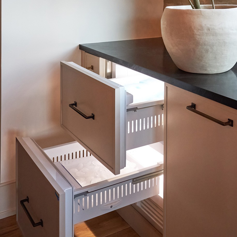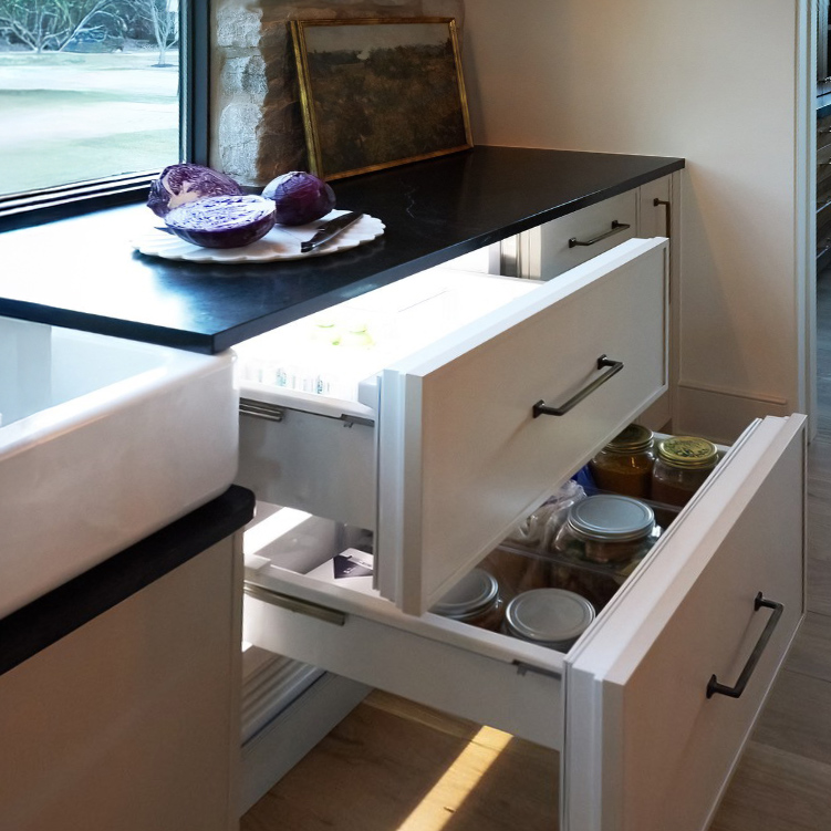 - Distributing storage creatively – including deep island drawers, concealed tall cabinetry, under-banquette storage, and under-counter refrigeration – to support function without cluttering the room