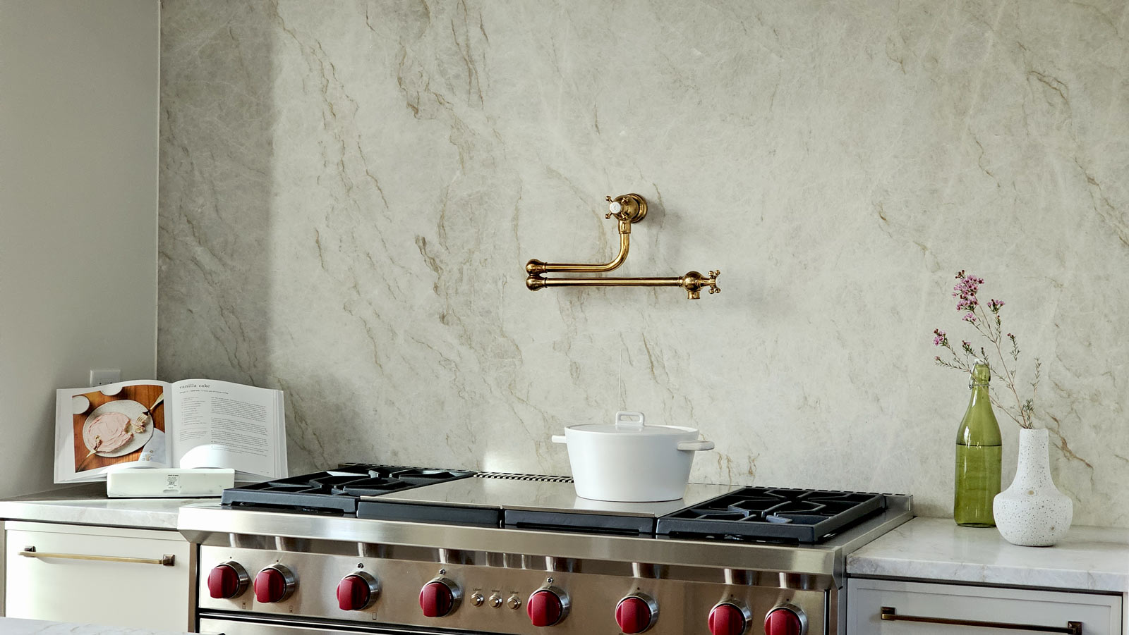 - Incorporating tall, shallow display cabinets with reeded glass to visually anchor the range wall, while concealing deeper utility storage within adjacent side-access cabinets