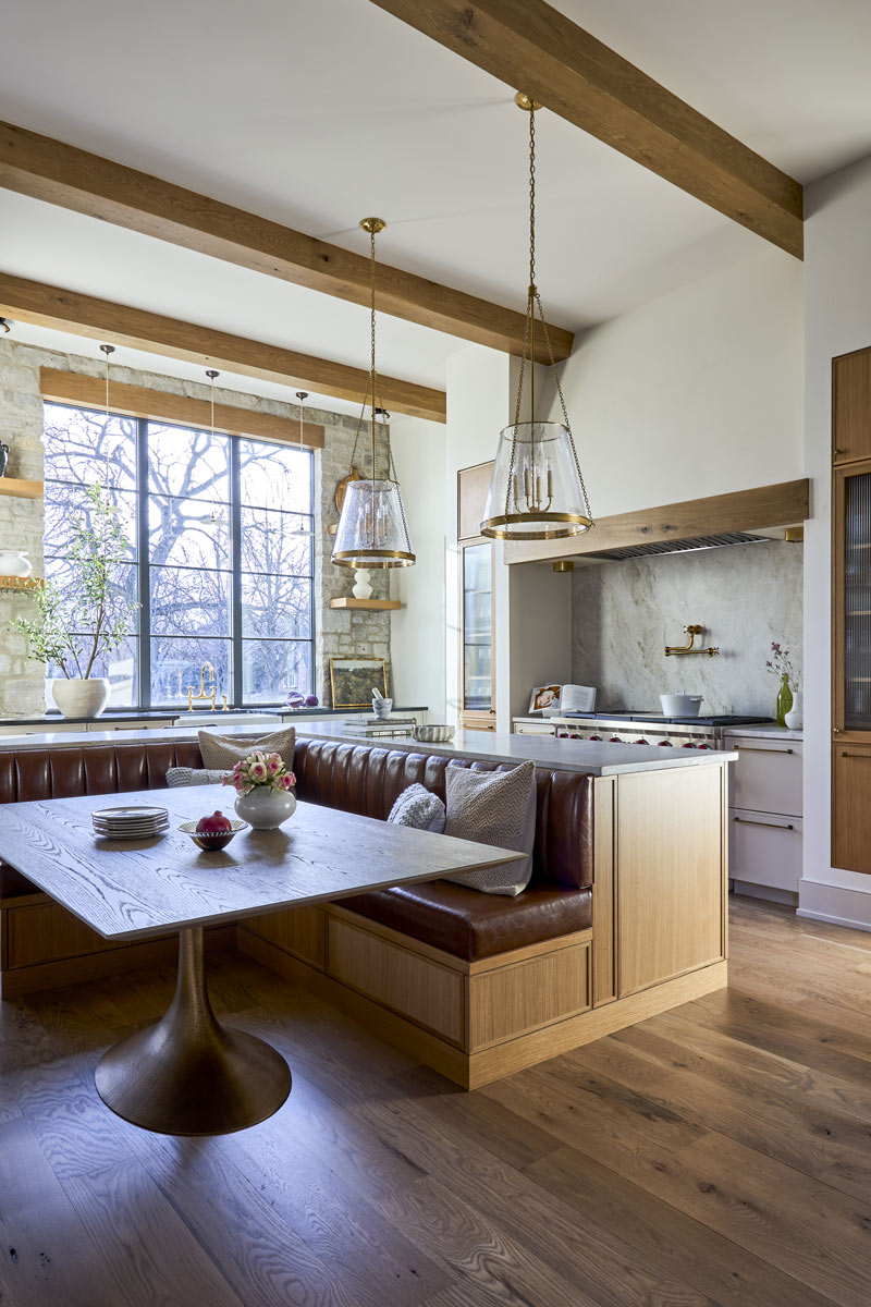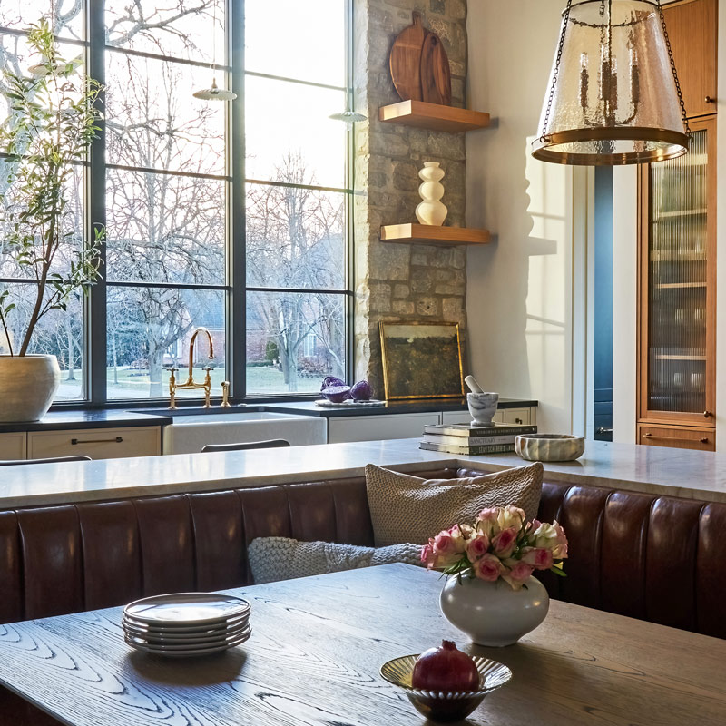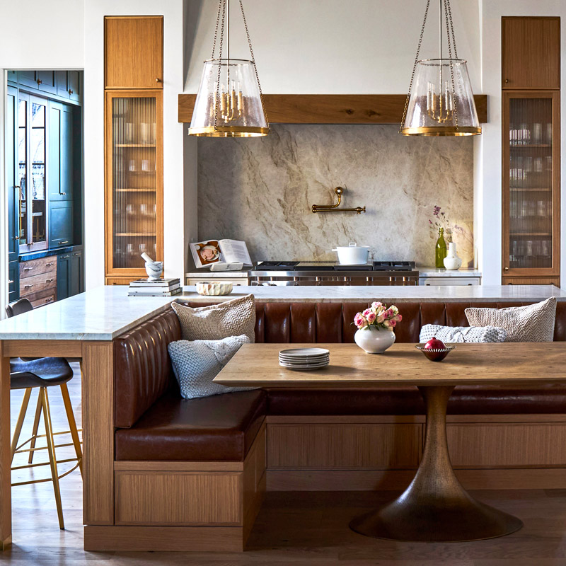 - Replacing a standalone breakfast table design with a custom banquette integrated into the island layout, preserving circulation while offering multiple seating options