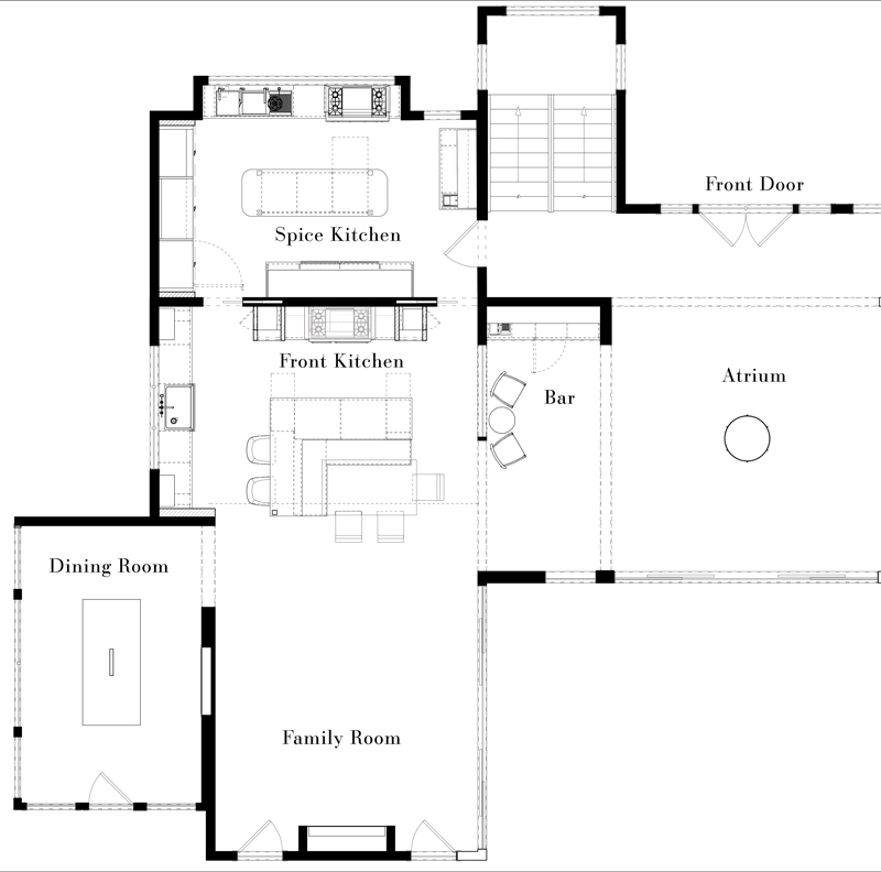 Together, these kitchens form a system rather than a hierarchy. On a daily basis, family members move easily between them – entering the spice kitchen from the hall, cooking and prepping where it makes sense, then gathering in the front kitchen to eat, talk, and connect. The spaces blur and separate as needed, adapting to both quiet routines and lively gatherings.