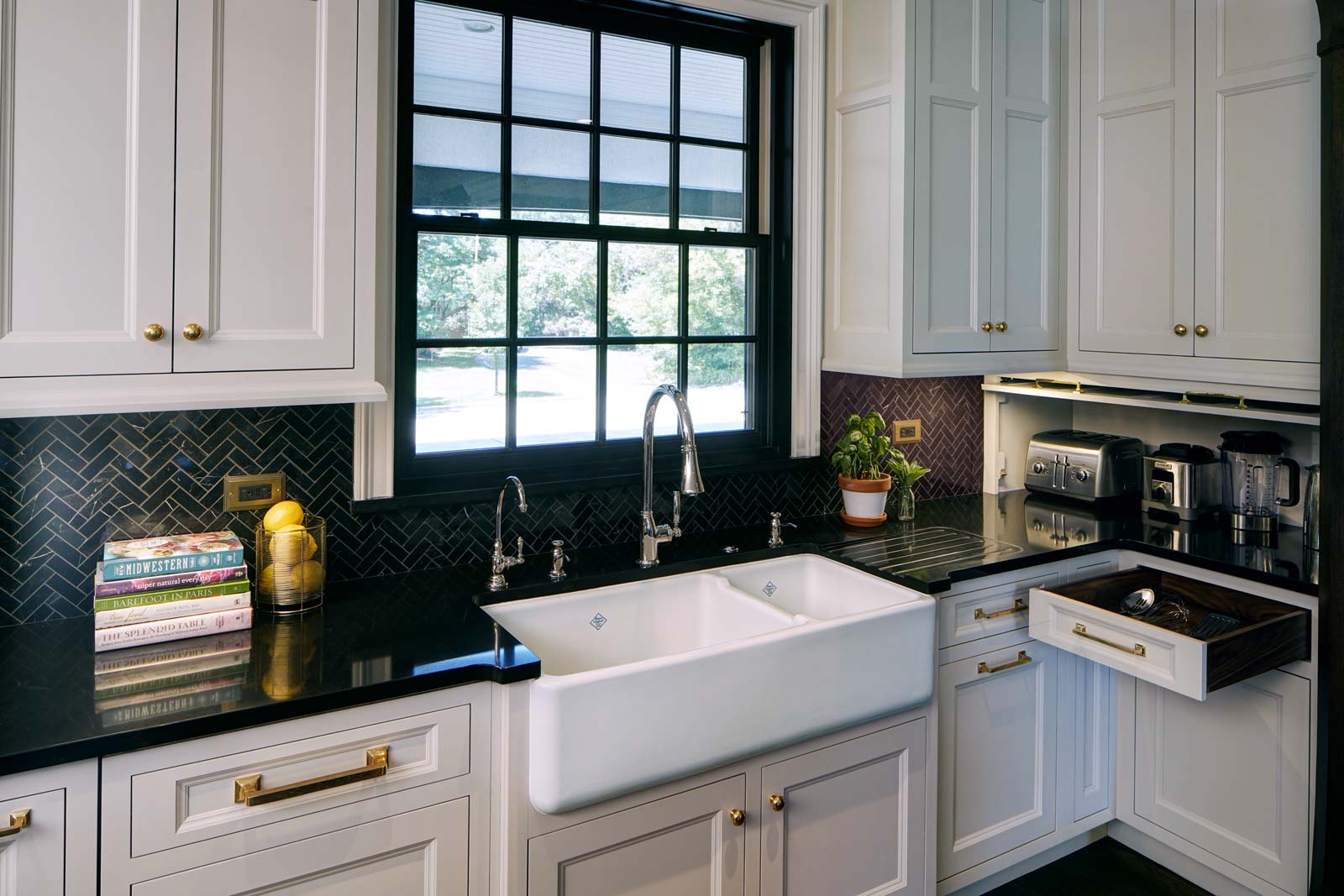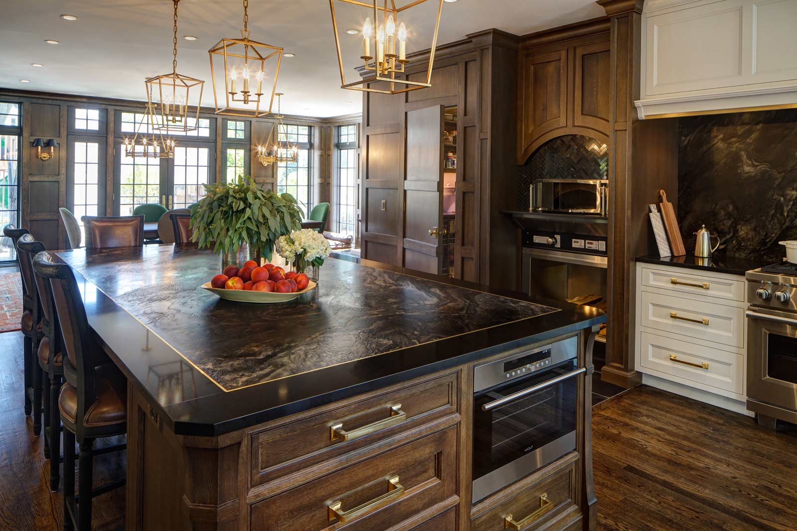 Despite the expansiveness of the space, the design and layout create a feeling of intimate proximity for each kitchen activity. The rich cabinetry, complimentary details and dramatic dark tones create warmth.