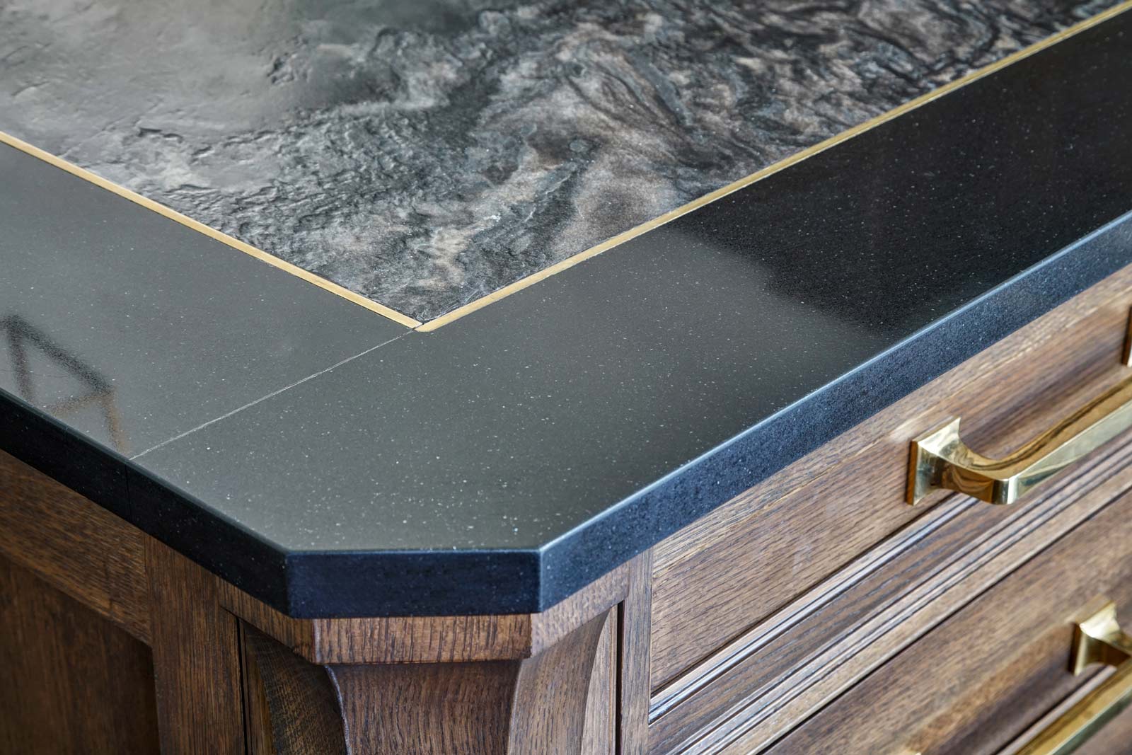 The marquee island top features Silver Fusion quartzite inlaid into Crea Brenton quartz with a brass liner in between.