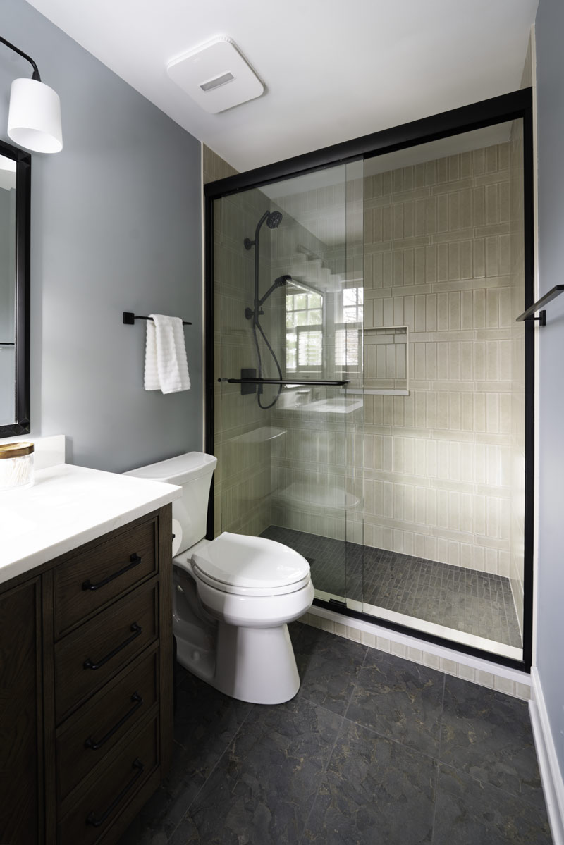 In the hall bath, function led the way. Visiting parents meant a bathtub was no longer the best solution, so it was replaced with a walk-in shower — easier to use, easier to navigate, and better suited for guests of all ages.